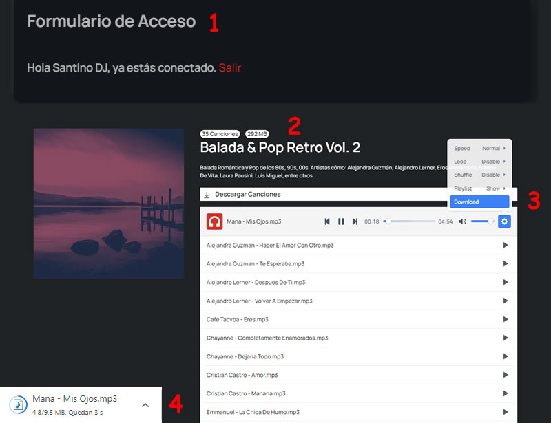 El reproductor está habilitado para probar la calidad de las canciones (Tarda aprox. 5 seg en cargar la canción). Para escuchar de forma fluída y sin cortes, podes solicitar para tu Pendrive.